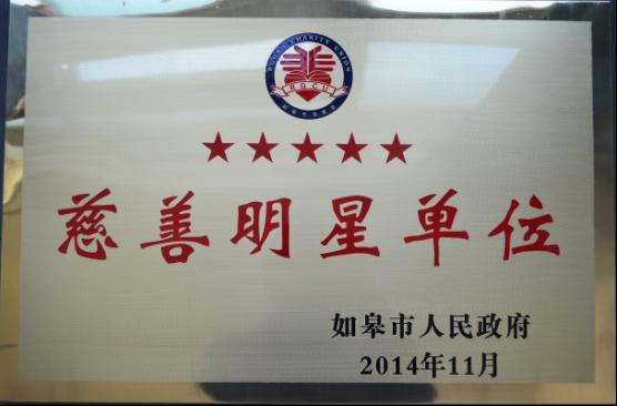 112,在如皋市委、市政府舉辦的2014愛心月捐贈活動中,江蘇力星通用鋼球股份有限公司榮獲★★★★★慈善明星單位,施祥貴董事長榮獲最具愛心個人獎。